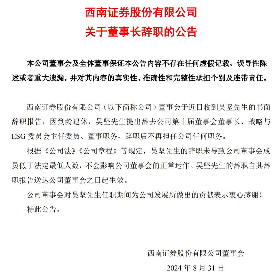 公告显示,西南证券董事会近日收到吴坚书面辞职报告,因到龄退休,吴坚提出辞去公司第十届董事会董事长、战略与ESG委员会主任委员、董事职务,辞职后不再担任公司任何职务。公司董事会对吴坚任职期间为公司发展所做出的贡献表示衷心感谢。